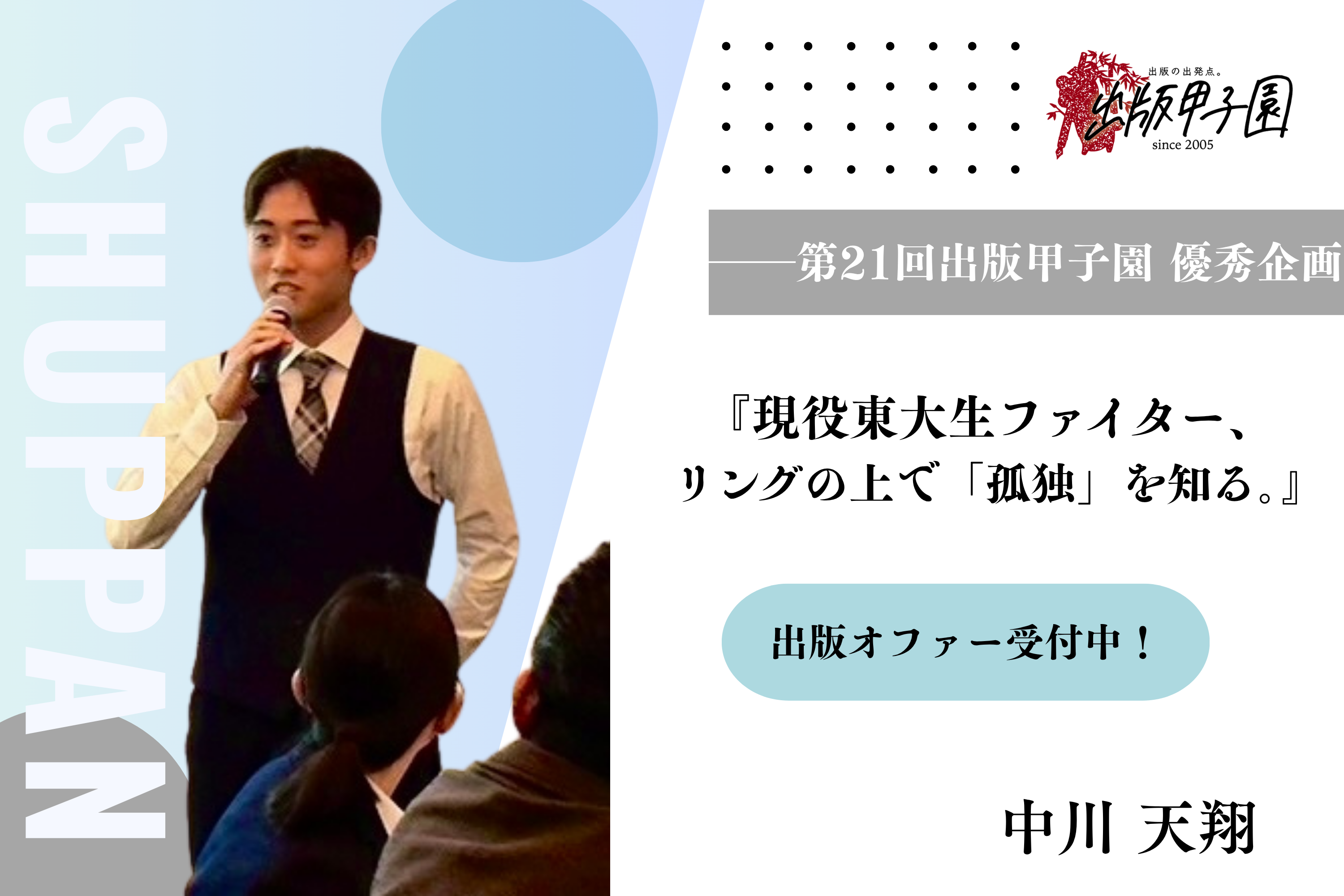 企画紹介記事サムネ 2025-11-17 最終更新日時 : 2025-11-17 出版甲子園実行委員会 お読みいただきありがとうございます!その他の情報はこちらから! 概要出版甲子園とは 応募本の企画を書く 観覧決勝大会を観る
