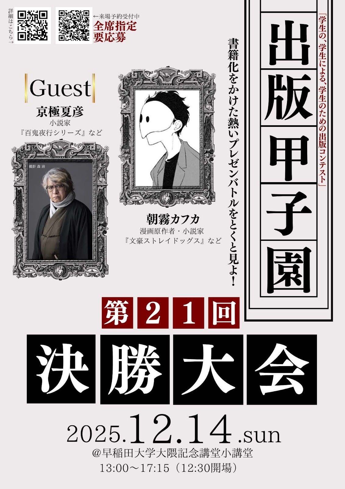 image 2025-12-11 最終更新日時 : 2025-12-11 出版甲子園実行委員会 新歓特設ページ Special welcome pages 団体概要出版甲子園実行委員会とは 概要説明 出版甲子園実行委員会は、早稲田大学公認の出版&イベント系学生団体です。全国の学生から […]Read more大学新歓本ページでは各大学における入学式・新入生オリエンテーションにおける新歓活動についてご紹介いたします。 早稲田大学 ブース […]Read more単独新歓概要 単独新歓とは、出版甲子園実行委員会が単独で行う新歓イベントです。様々な場所・形態にて実施予定です。入会していただく […]Read moreよくある質問出版甲子園実行委員会について 早稲田大学公認サークルということで、早稲田生が多いですか? 早稲田生は全体の約4割を占めて […]Read more入会方法入会資格 ・単独新歓のいずれかに参加すること(いずれも参加できない場合はお問合せください)・大学生であること(学年は問い […]Read more 新歓SNS ホームページ以外でも様々なSNSで情報を発信中です!フォローお願いします!(お気軽にお問合せください!) 新歓公式LINEお問合せください! 新歓Instagram有益な情報を発信中! 新歓X有益な情報を発信中!