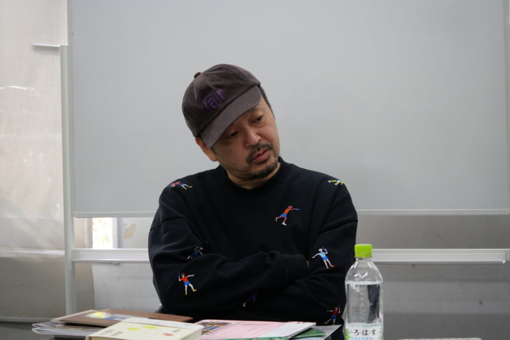 大島さんは、『万引き家族』や『秒速5センチメートル』『ミッドタイムサマー』など多数の映画ポスター、パンフレットを手掛けるかたわら、『君のクイズ』など書籍の装丁も手掛けるデザイナーです。第一線で活躍されているデザイナーの方の対談は、貴重な機会であり団体員一同も興味津々といった様子でした。
