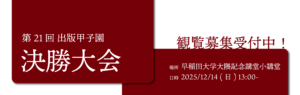 SPK_バナー copy-02 2025-11-18 最終更新日時 : 2025-11-18 出版甲子園実行委員会 お読みいただきありがとうございます!その他の情報はこちらから! 概要出版甲子園とは 応募本の企画を書く 観覧決勝大会を観る
